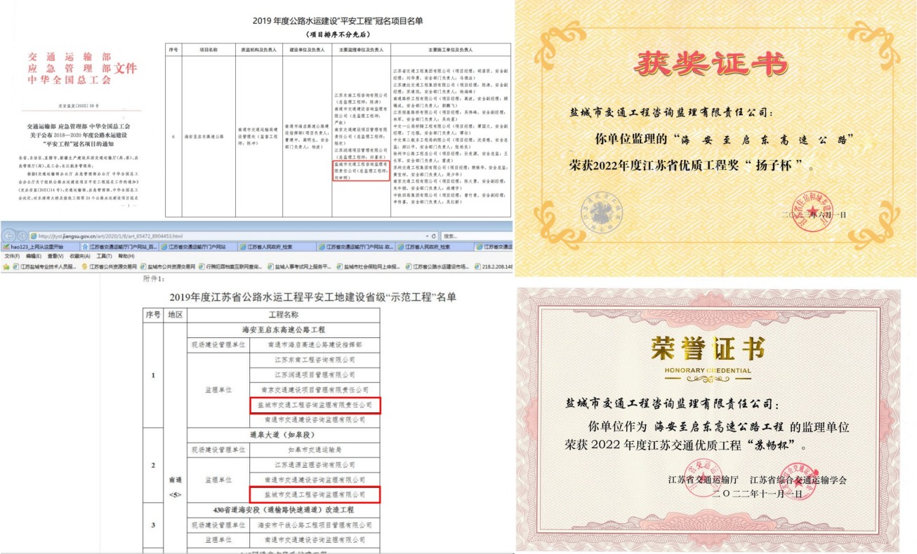 △海启高速公路荣获江苏省“扬子杯”优质工程奖、全国2019年度公路水运建设“平安工程”冠名、江苏省公路工程平安工地省级“示范工程”、江苏省劳动竞赛先进集体等荣誉称号