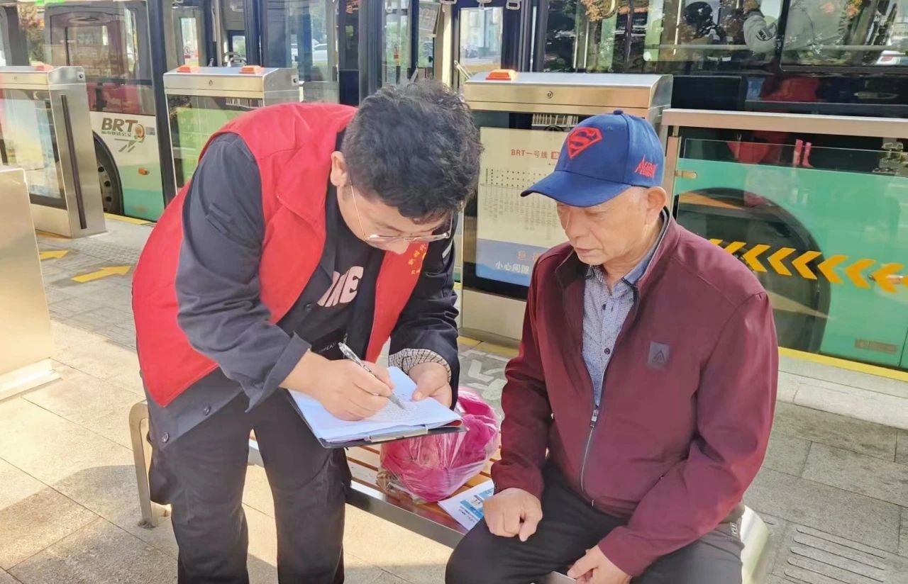 公交站台候车区域,志愿者们带着精心自制的香囊和艾草养生锤,结合“两问一宣”(即问需求、问建议、宣传安全出行)的方式,为银发一族送去了温暖与关怀。