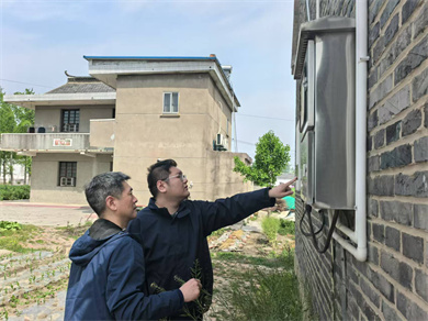 在沐阳公司新能源农户屋顶分布式光伏项目现场,安全检查小组检查了电池组、支架、连接器、电池箱、逆变器、电缆、防雷接地等重点设备的安全和消防情况。