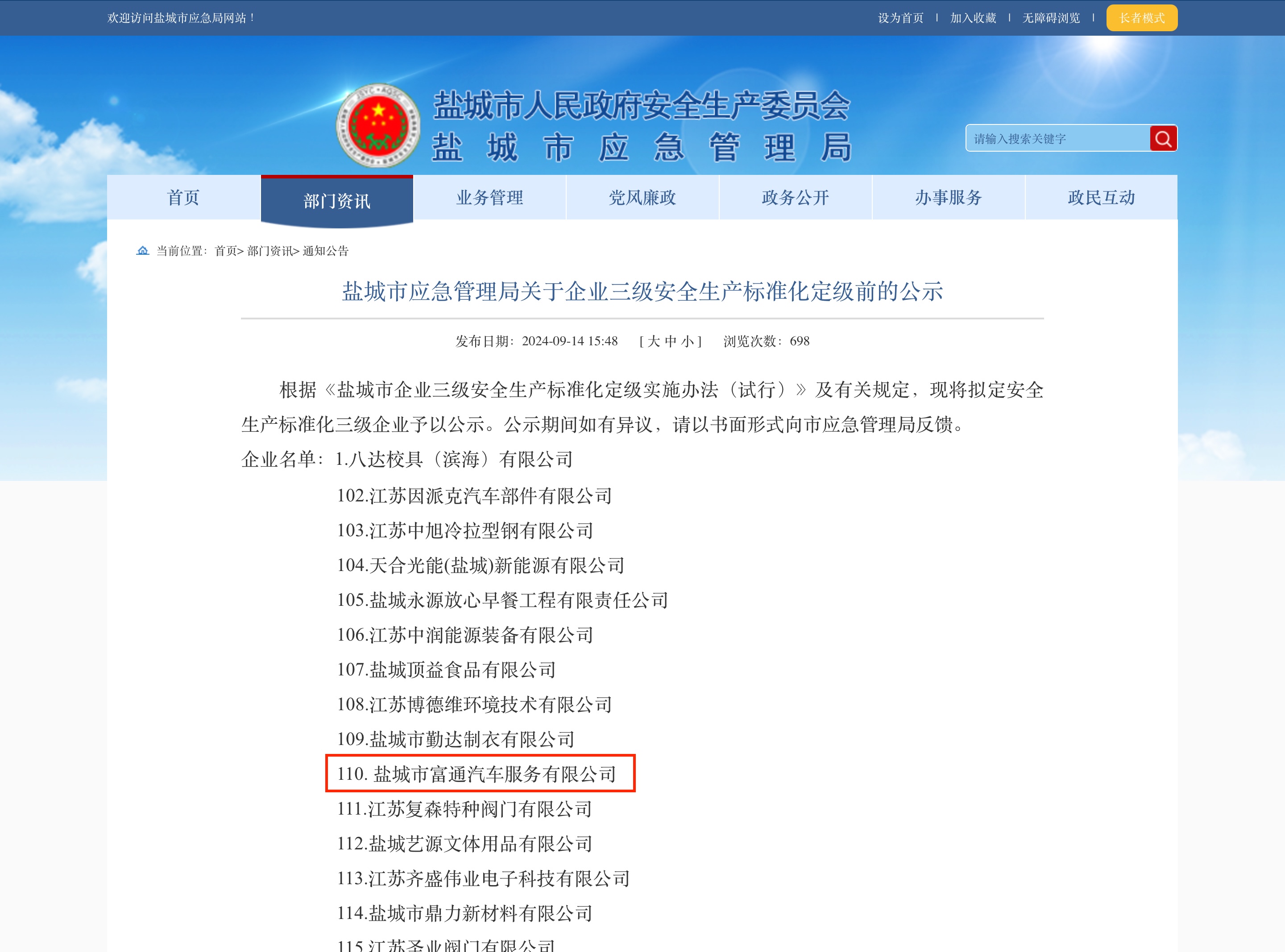 返回列表近日,市应急管理局发布了《企业三级安全生产标准化定级公告》,市公务车平台顺利通过安全生产标准化三级企业认证,标志着平台安全生产规范化、科学化、标准化水平实现提质升级,也标志着平台安全工作步入新征程。